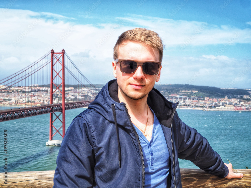 Samolepka The blonde man stands in the background of the 25th of April bridge in Lisbon