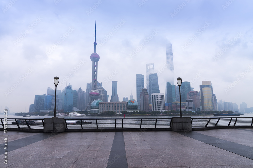 Samolepka Shanghai high rises office and towers of the Business district skyline at mist behind a pollution haze, across Huangpu river, Shanghai, China