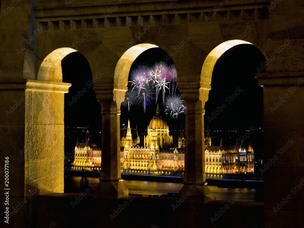Samolepka Hungarian Parliament through Fishermans bastion with fireworks