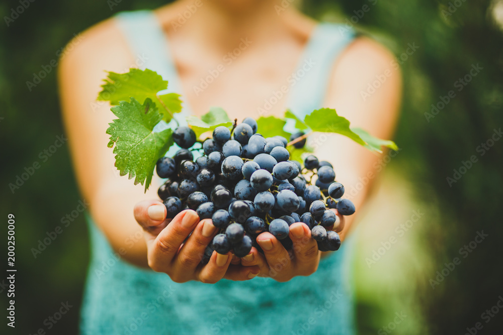 Samolepka the girl is holding a fresh juicy ripe grapes