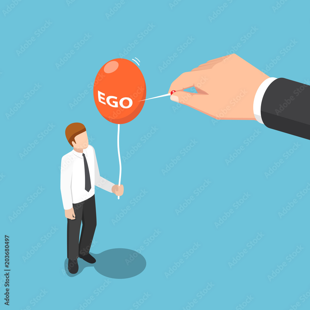 Samolepka Isometric big hand use needle to destroy ego balloon of businessman