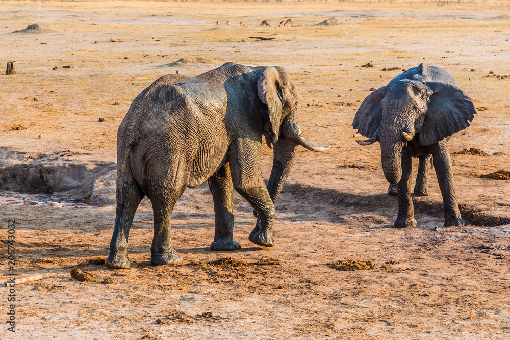 Samolepka Two elephants fighting over a small amount of water during a drought in Hwange National Park, Zimbabwe