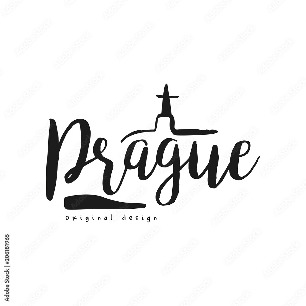 Samolepka Prague european capital city name, original design, black ink hand written inscr