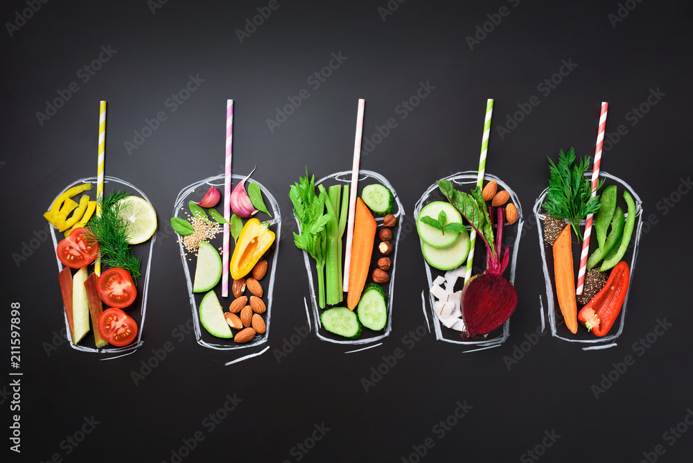 Samolepka Food ingredients for blending smoothie or juice on painted glass over black chalkboard