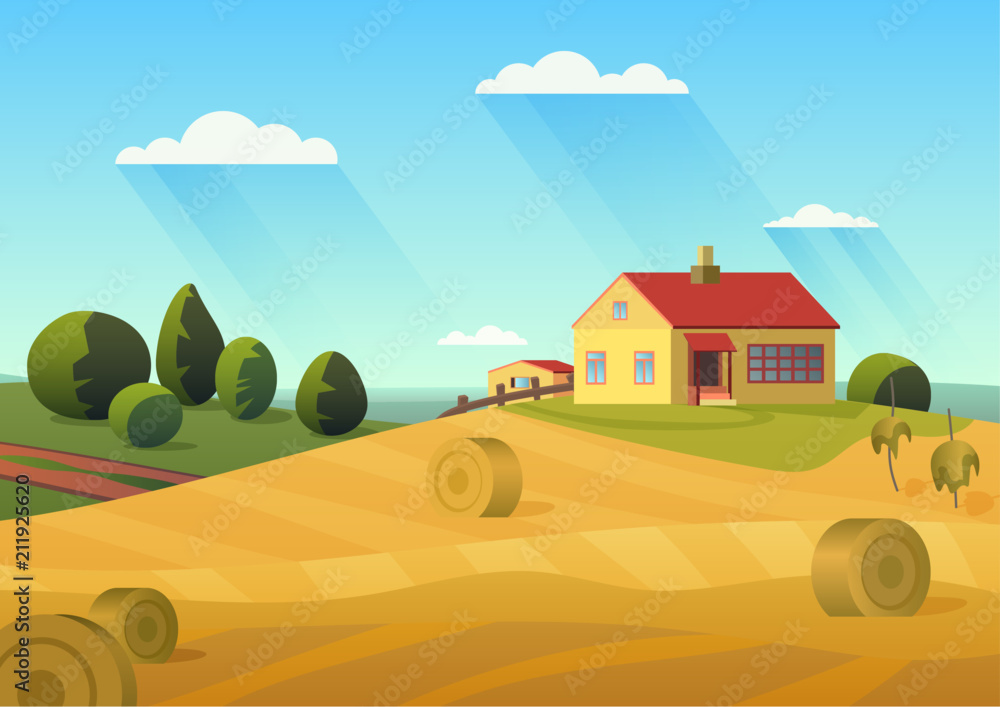 Samolepka Colorful vector illustration of farmhouse in countryside with golden haystacks and blue sky
