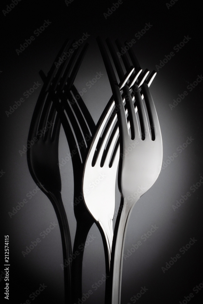 Samolepka Two interlocking shiny forks on reflective black background for artistic minimalist still life