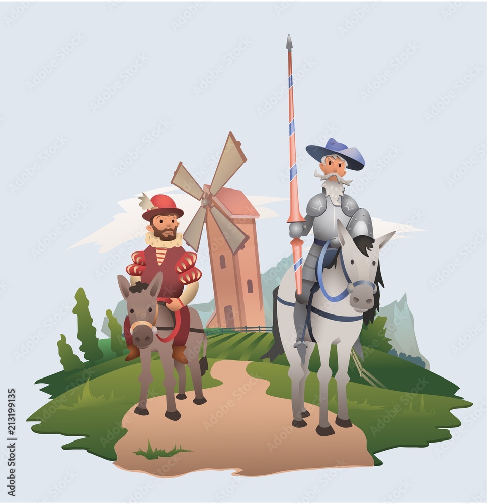 Samolepka Don Quixote and Sancho Panza riding on windmill background