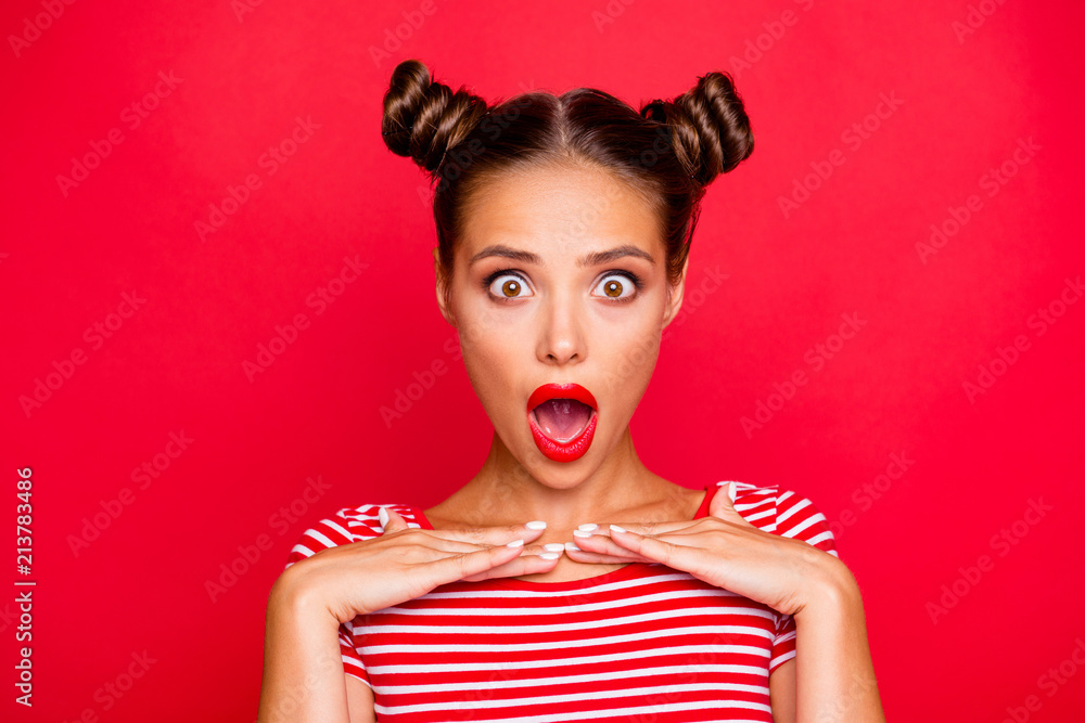 Total sale! Close up portrait of excited and surprised young brunette girl who opened wide her mouth and eyes isolated on red background