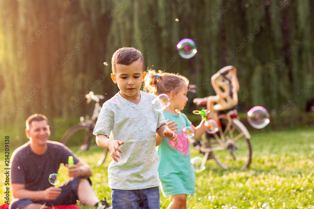 Samolepka family time- Cheerful children chase bubbles in nature.