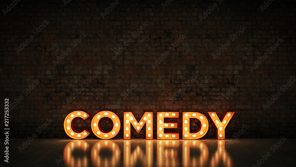 Samolepka Neon Sign on Brick Wall background - comedy. 3d rendering