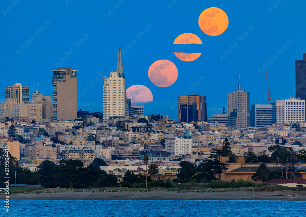 Samolepka Panorama of multiple moonrise above San Francisco Downtown viewed from Marina Di
