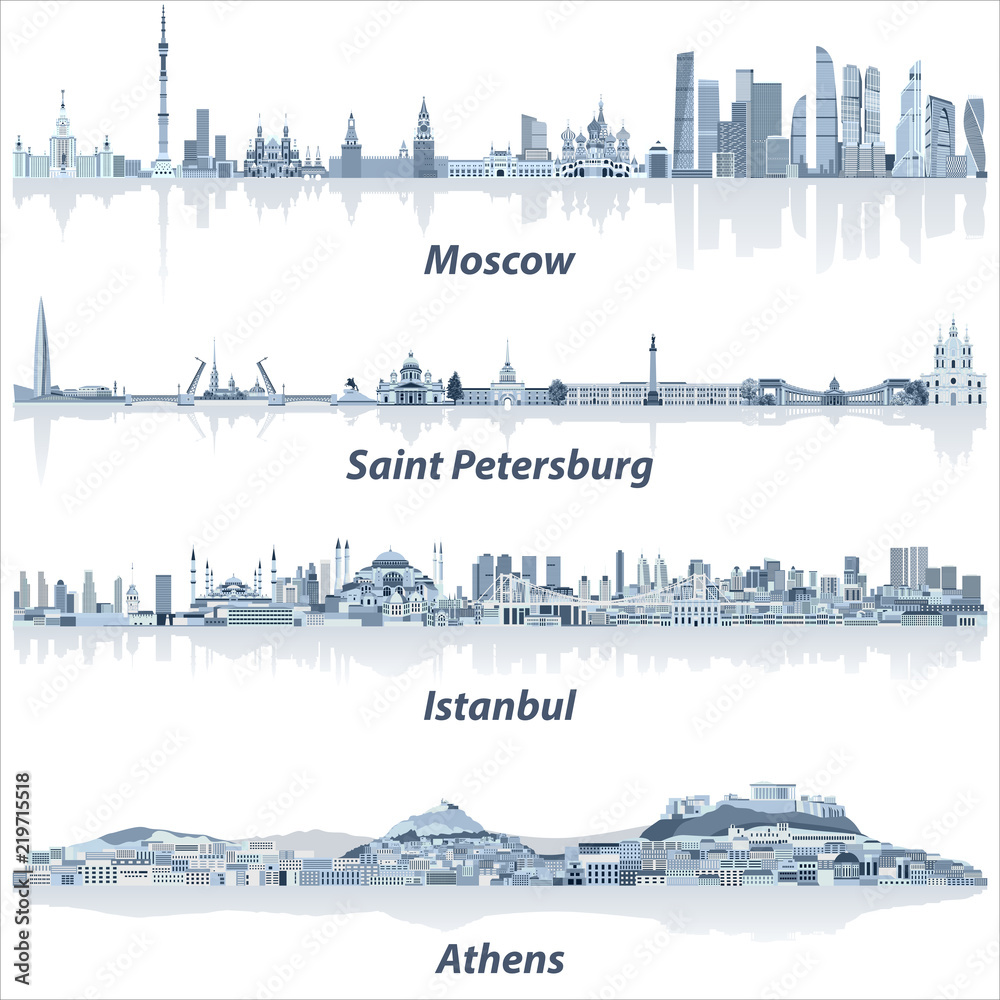 Samolepka Moscow, Saint Petersburg, Istanbul and Athens vector cities skylines in soft blu