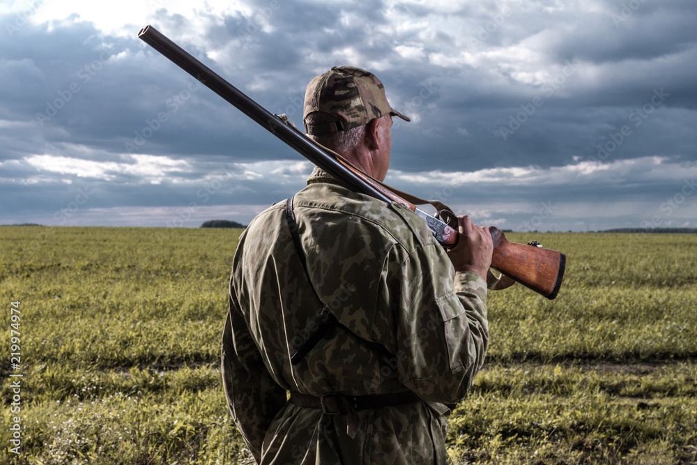 Samolepka Hunter with a gun on his shoulder against the background of the field