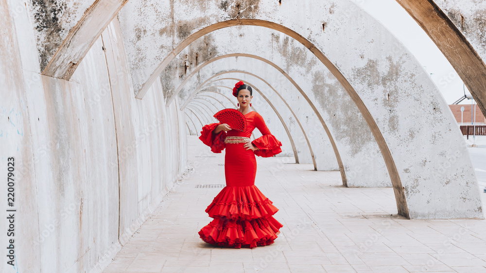 Samolepka Woman dressed in red dancing flamenco with red fan