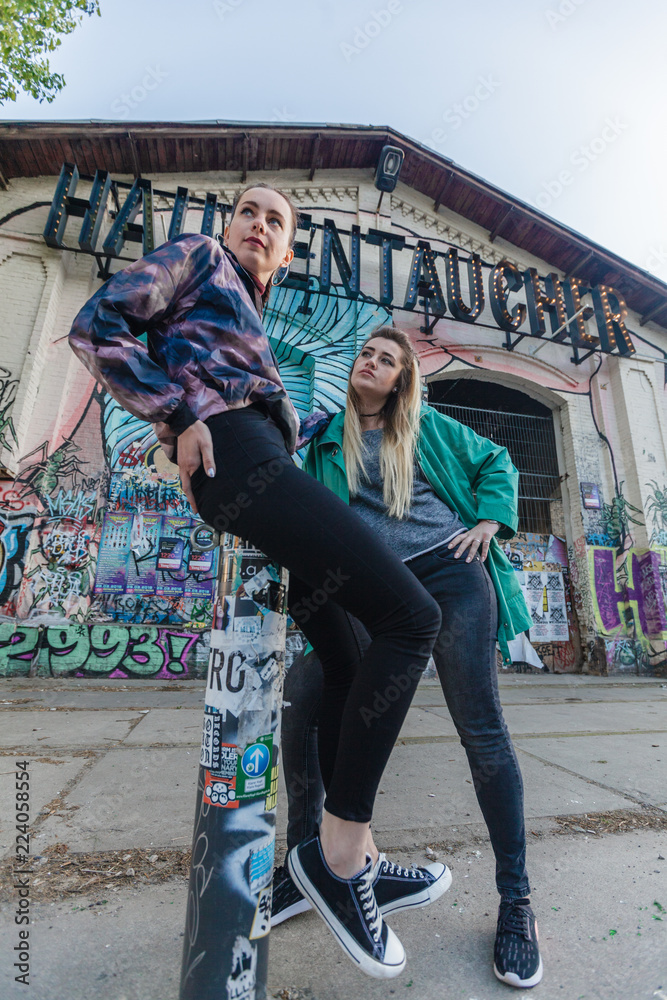 Samolepka Berlin, Germany - May 5 , 2018 : young girls are posing in front of graffiti wal