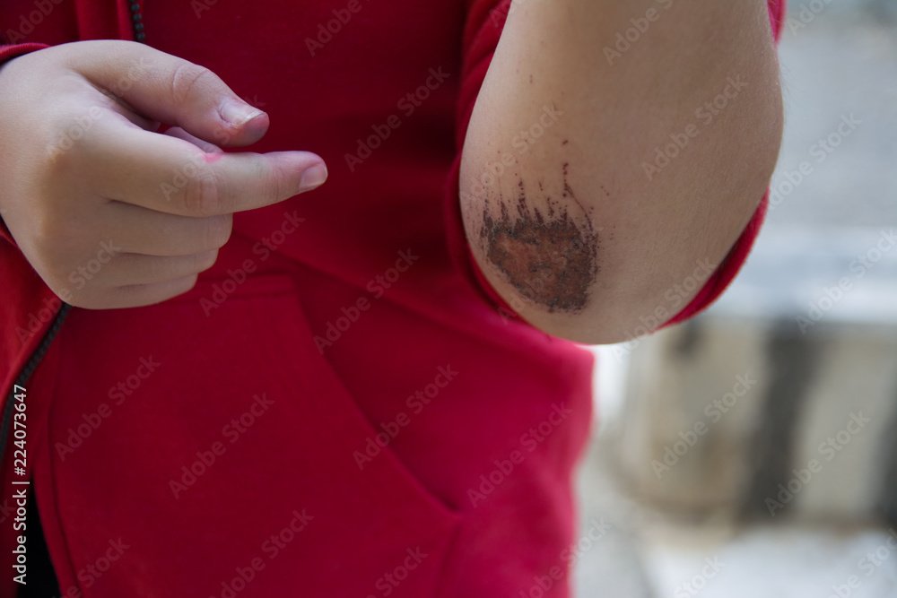 Samolepka Closeup of injured young kid's elbow after he fell down on pavement