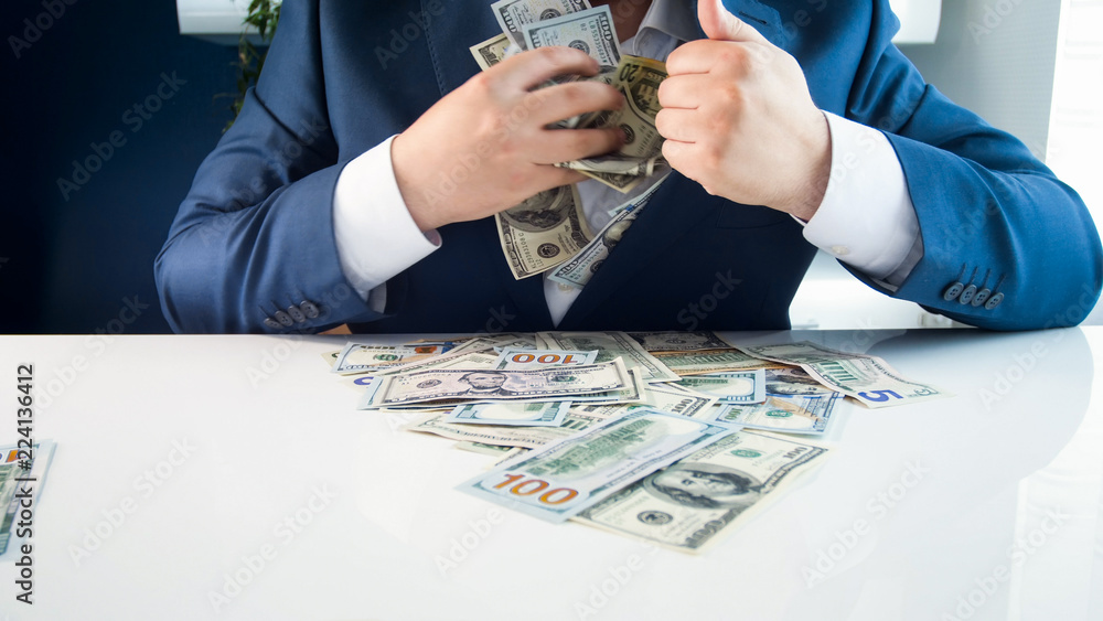 Samolepka Closeup photo of greedy covetous businesman filling his pockets with stacks of m