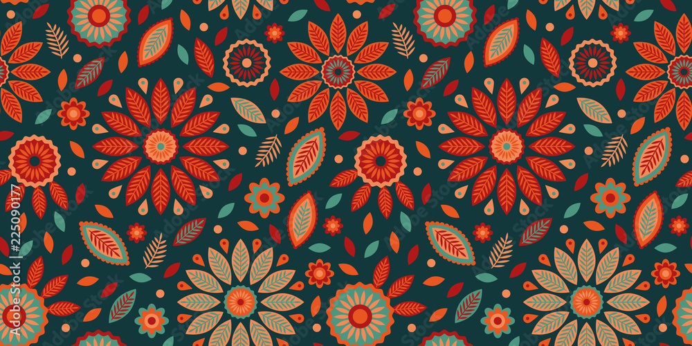 Samolepka Powerful colorful repeat pattern with leaves, dots and flower elements