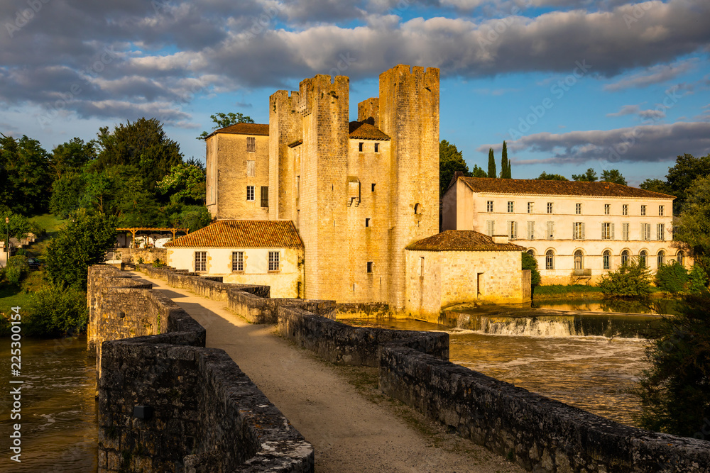 Samolepka Moulin des Tours- fortified mill in Barbaste, France, at sunset