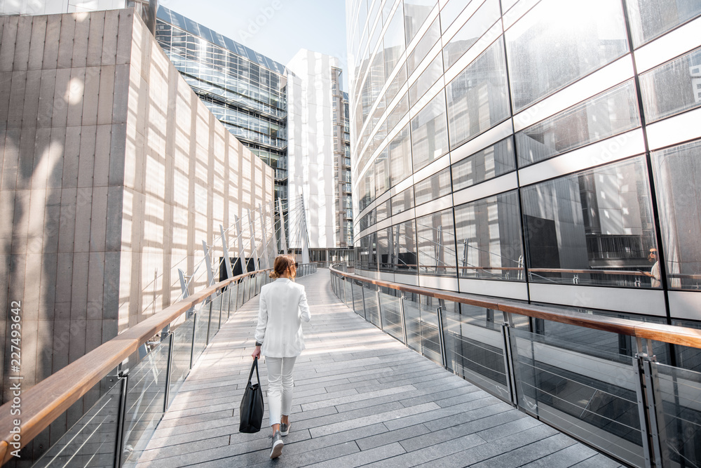 Samolepka Business woman walking outdoors at the financial district with modern buildings