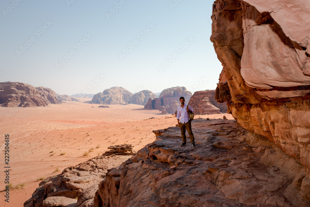 Samolepka Touriste homme dans le désert en Jordanie Sable rochers