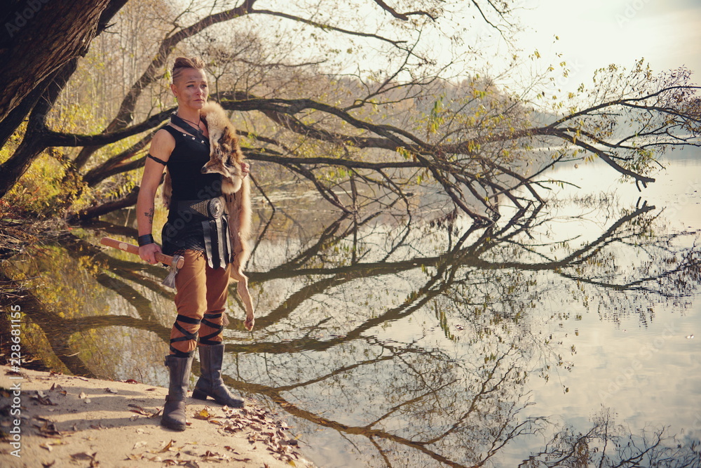 Samolepka Viking woman with axe in a traditional warrior clothes
