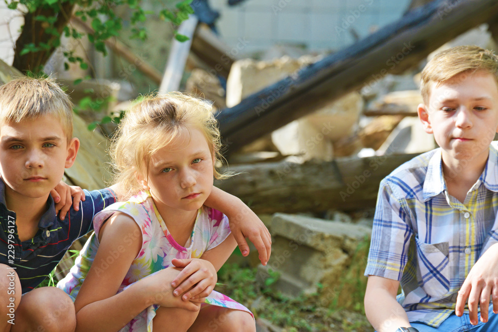 Samolepka Children are near the ruined house, the concept of natural disaster, fire, and devastation