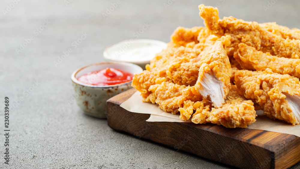Samolepka Breaded chicken strips with two kinds of sauces and fried potatoes on a wooden Board