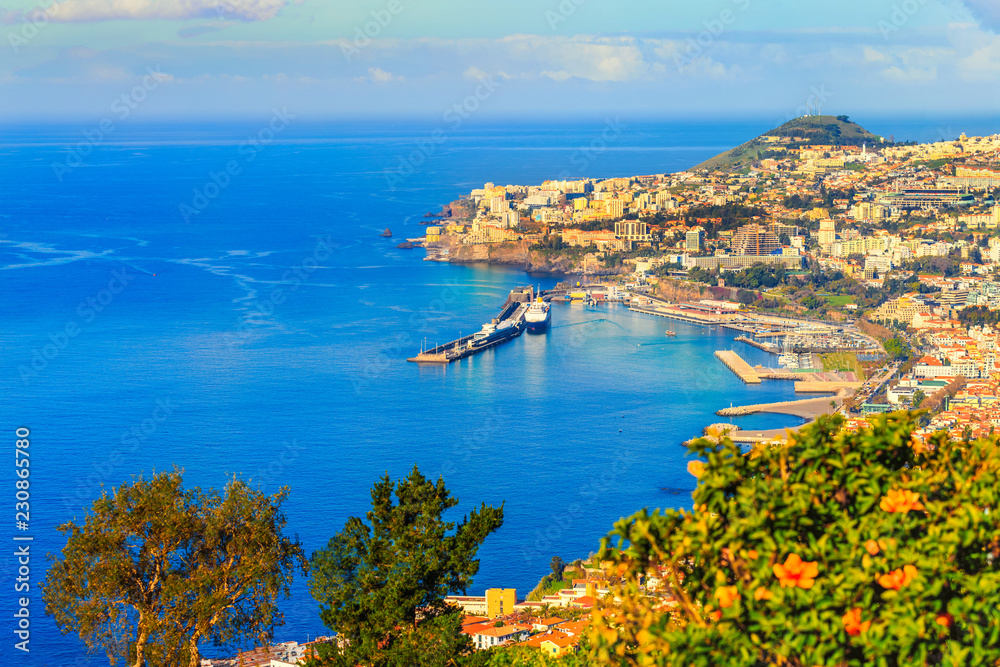 Samolepka Funchal capital, aerial view over Madeira island in summertime, Portugal