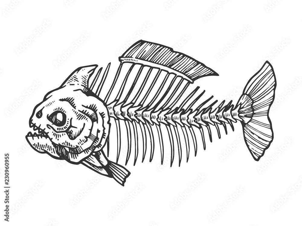 Samolepka Piranha fish skeleton animal engraving vector illustration