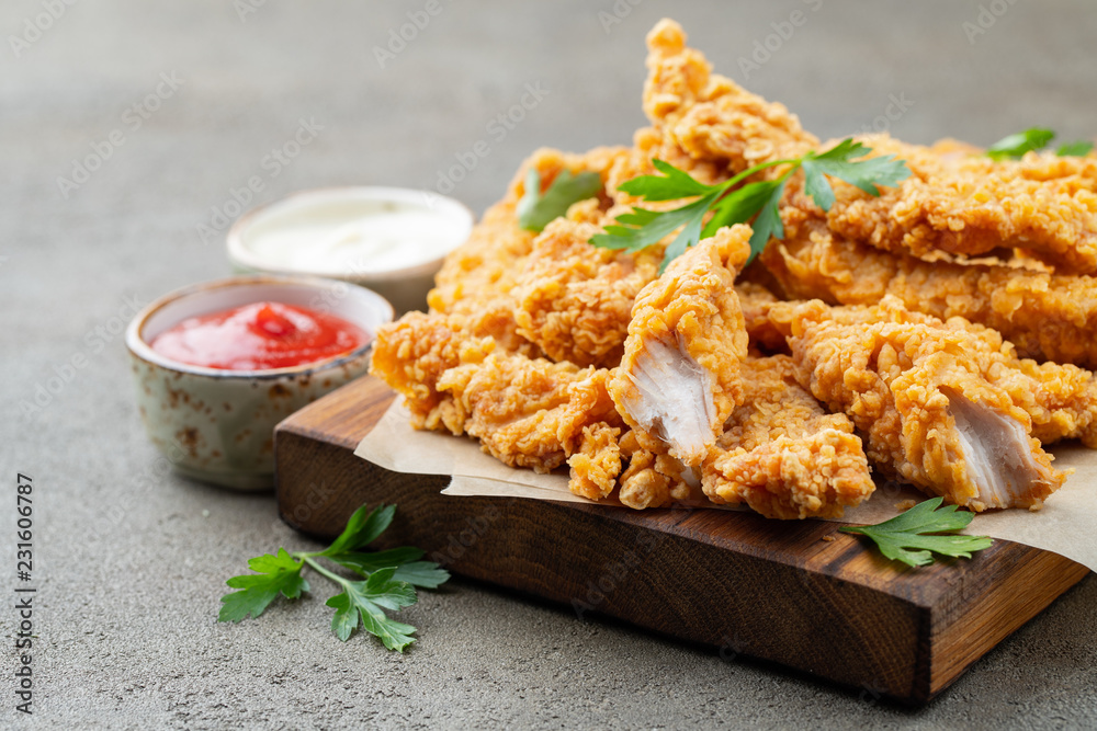 Samolepka Breaded chicken strips with two kinds of sauces on a wooden Board