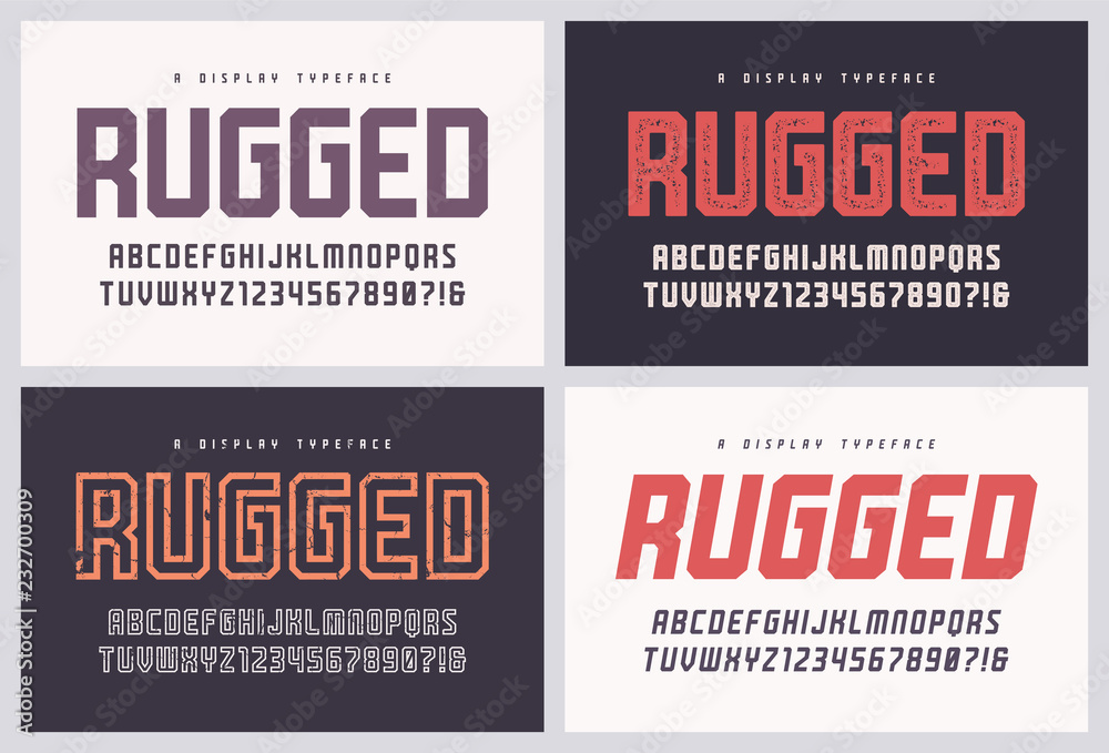 Samolepka Rugged san serif vector font, alphabet, typeface, uppercase letters and numbers