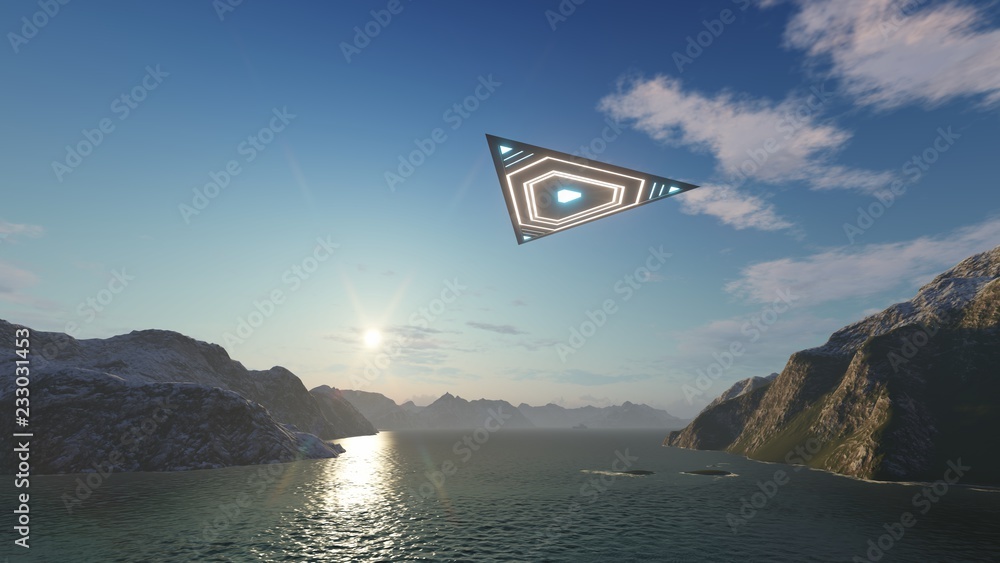 Samolepka 3D triangular ufo hung in the sky in the evening