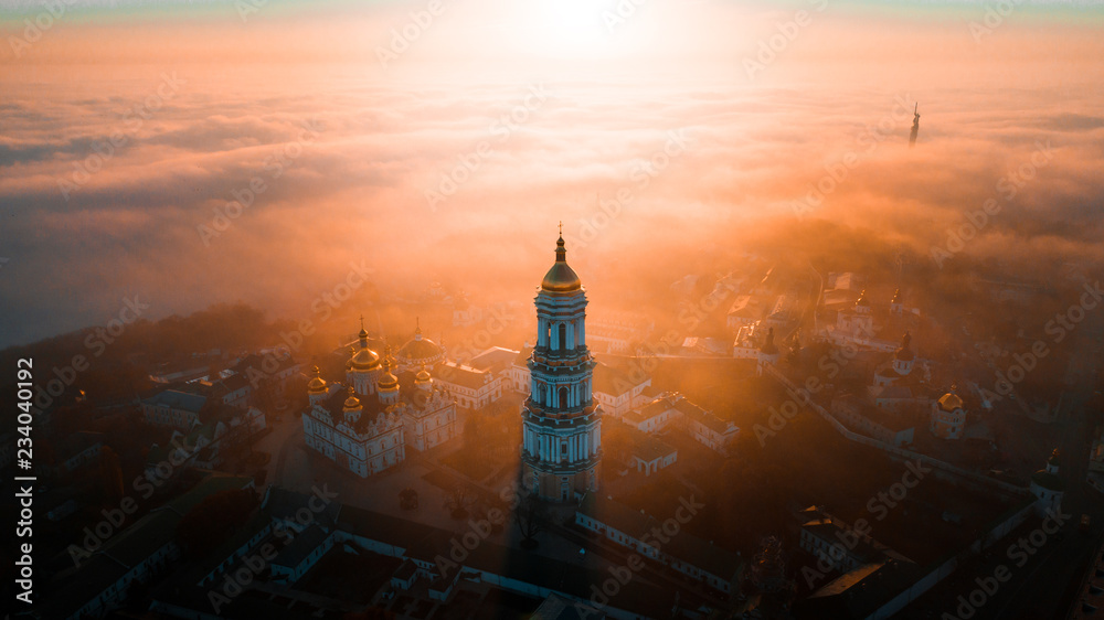 Samolepka Aerial view of Kiev Pechersk Lavra at dawn and the city covered with thick fog in the background