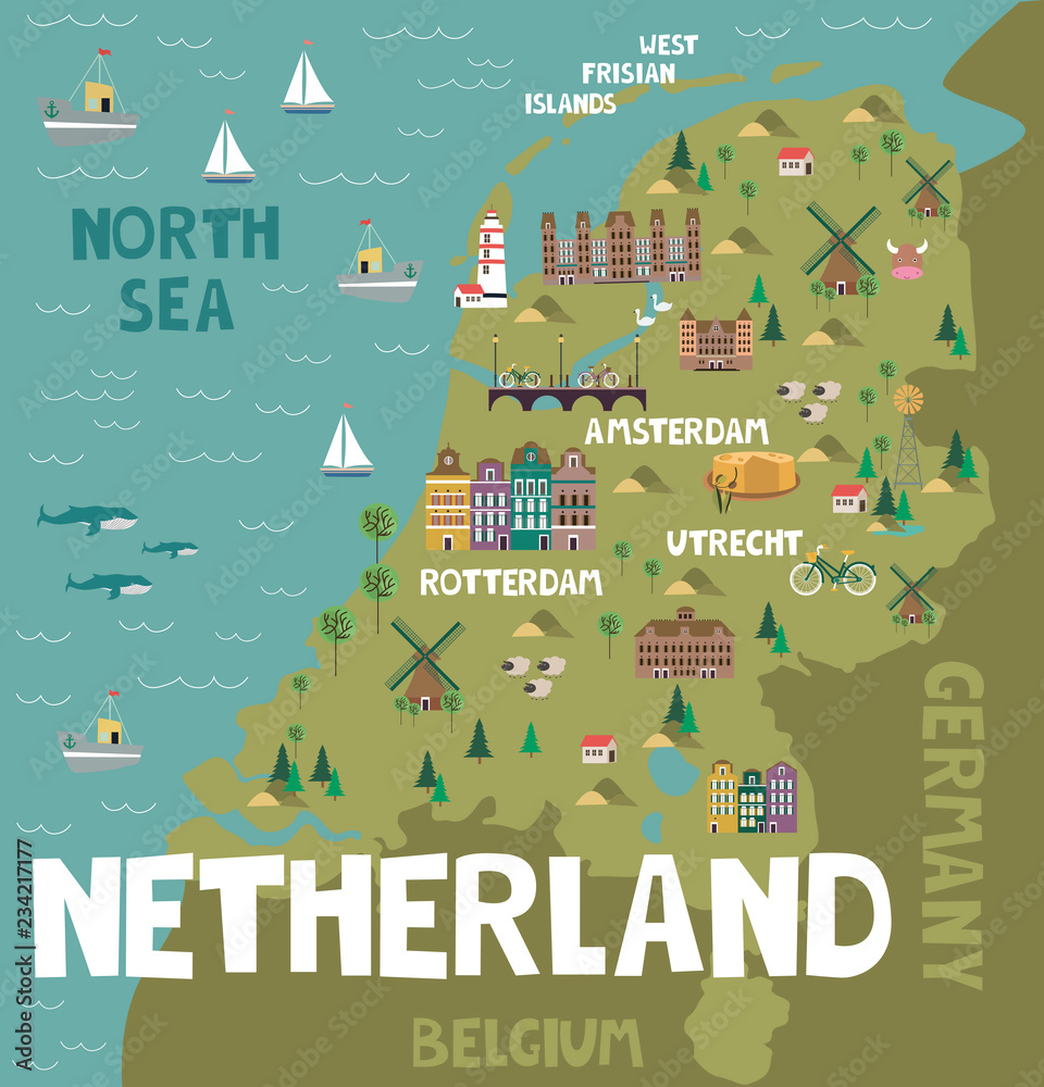 Samolepka Illustration map of Netherland with city, landmarks and nature