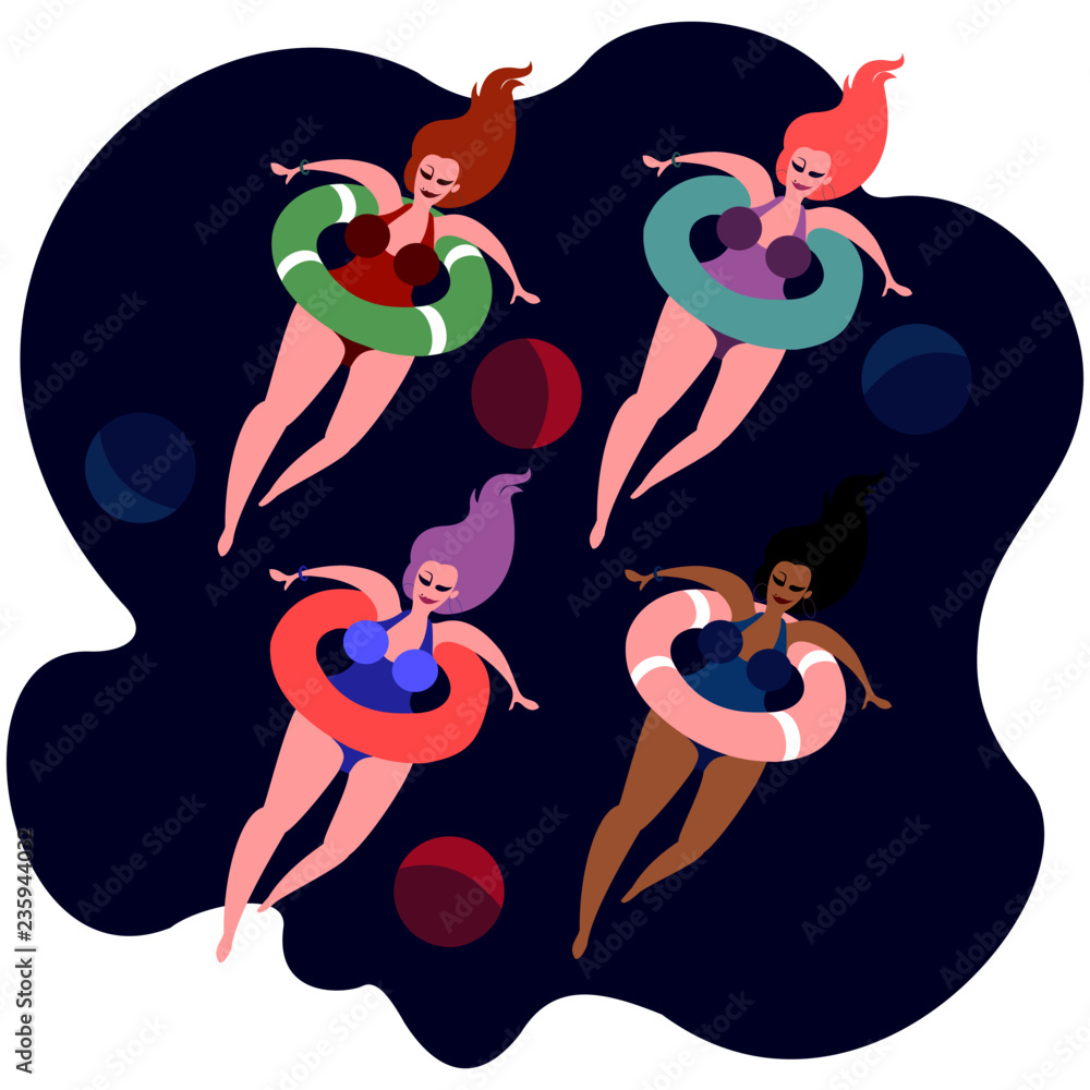 Samolepka body-positive plus size cute synchronized swimming team in colored swimsuits