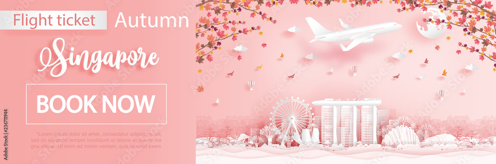 Samolepka Flight and ticket advertising template with travel to Singapore in autumn season