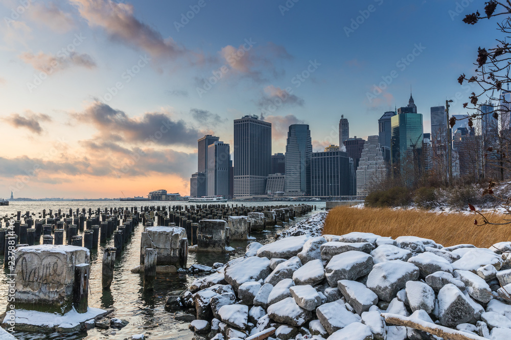 Samolepka View of Manhattan at sunset from the side of the pier.