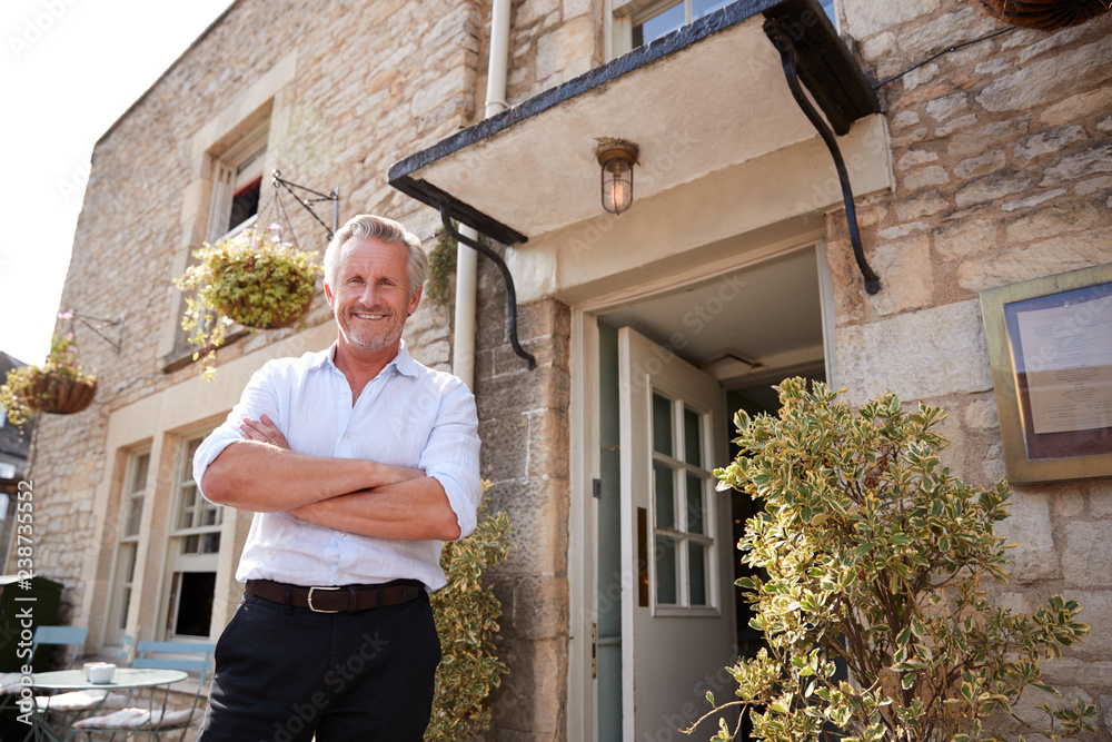 Samolepka Senior male restaurant pub owner stands outside the entrance