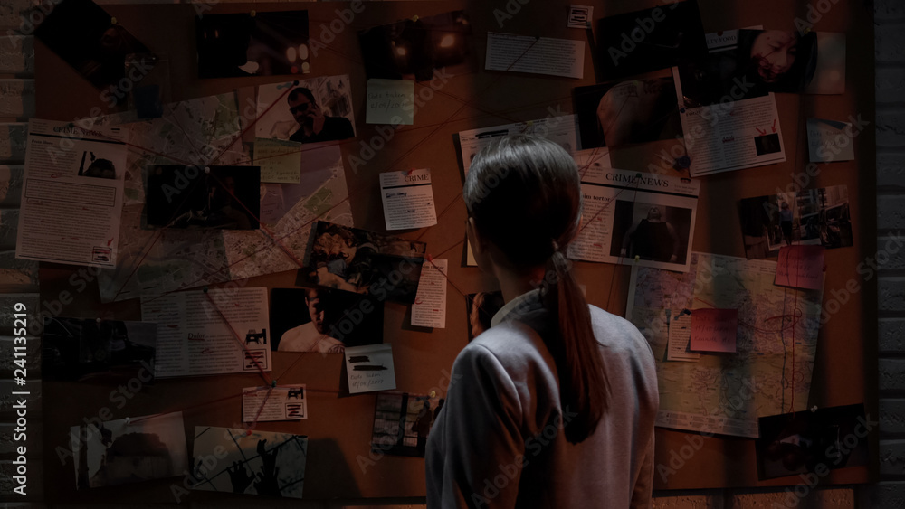 Samolepka Woman detective searching terrorist act connections, figuring out danger place