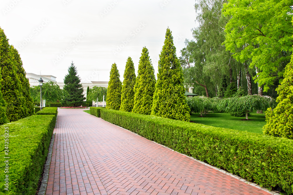 Samolepka Pedestrian pavement of tiles with trimmed deciduous bushes and evergreen thuja in the form of a pyramid, a park with green plants and trees, nobody