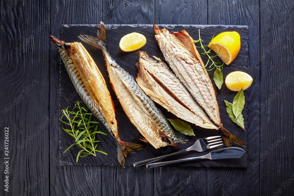 Samolepka close-up of smoked mackerel, top view