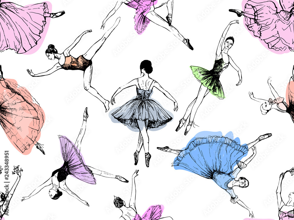 Samolepka Seamless pattern of hand drawn sketch style abstract ballet dancers isolated on white background