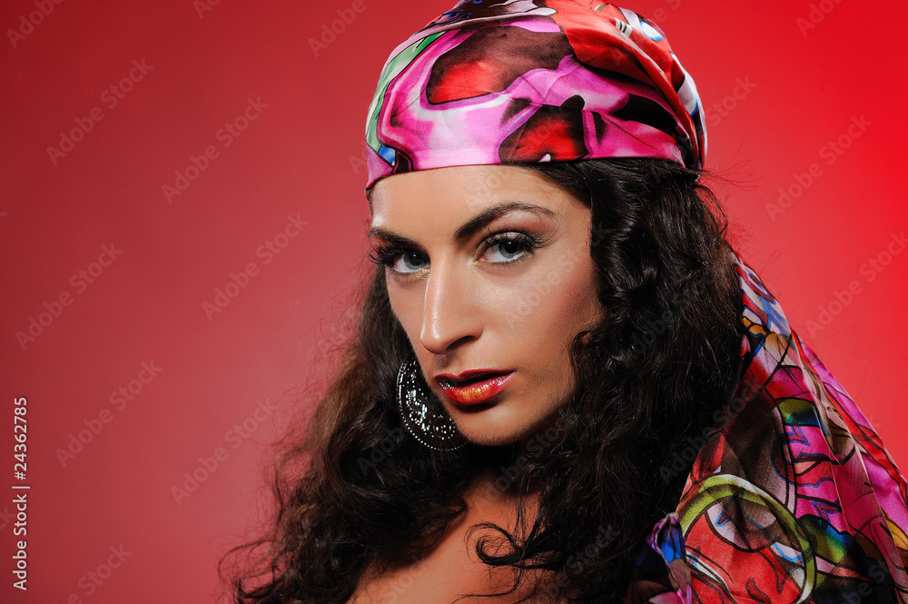 Samolepka Beautiful gipsy woman with bright make-up. red background