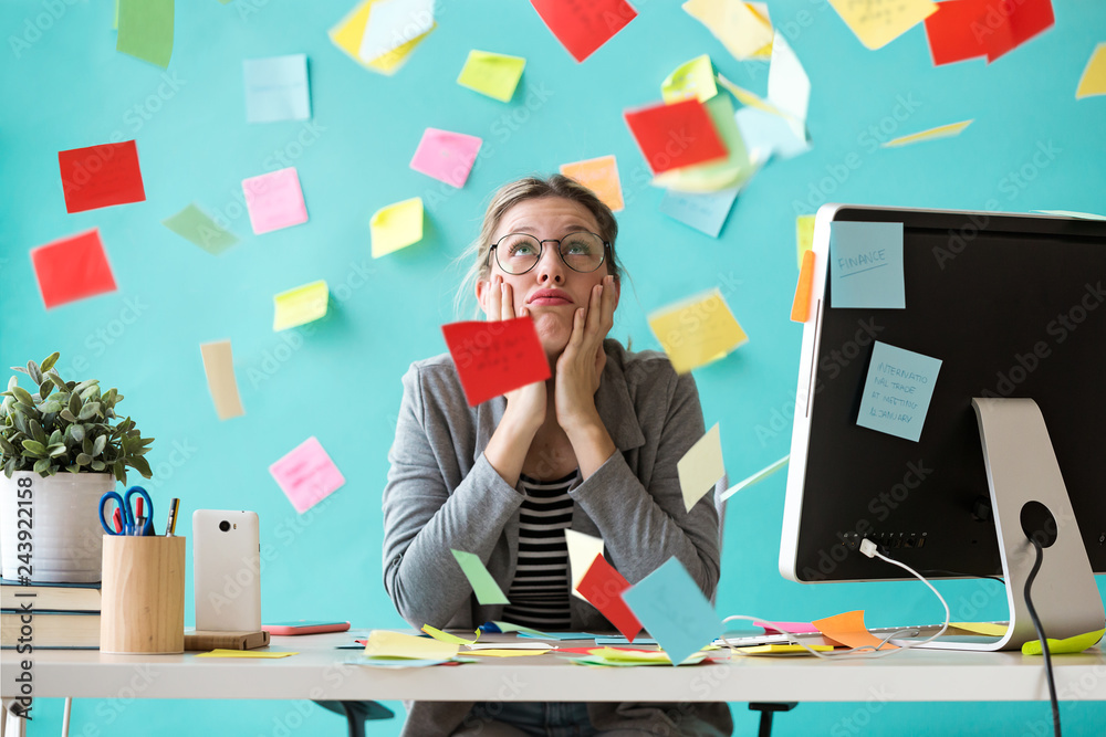 Samolepka Stressed young business woman looking up surrounded by post-its in the office
