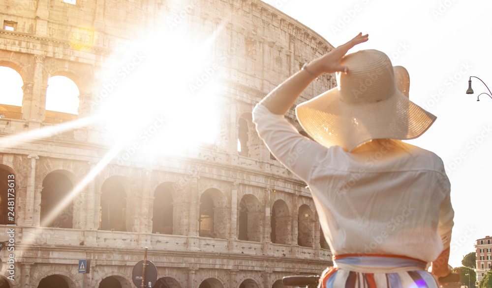 Samolepka Beautiful young woman in fashion dress alone in front of colosseum in Rome at sunset