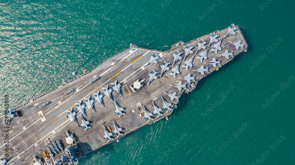 Samolepka Navy Nuclear Aircraft carrier, Military navy ship carrier full loading fighter jet aircraft, Aerial view