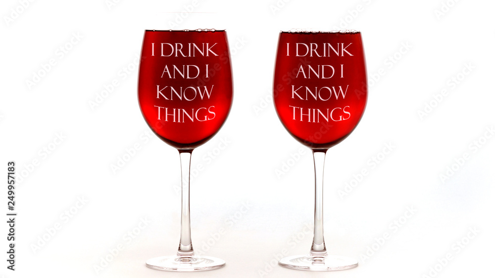 Samolepka Red wine glasses with I drink and I know things text on white background