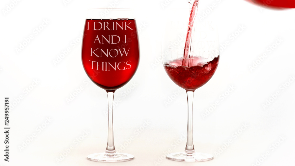 Samolepka Red wine glasses with I drink and I know things text on white background