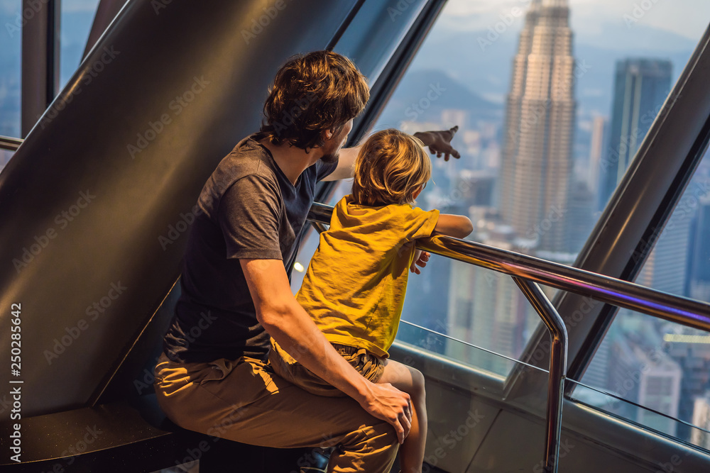 Samolepka Dad and son are looking at Kuala lumpur cityscape